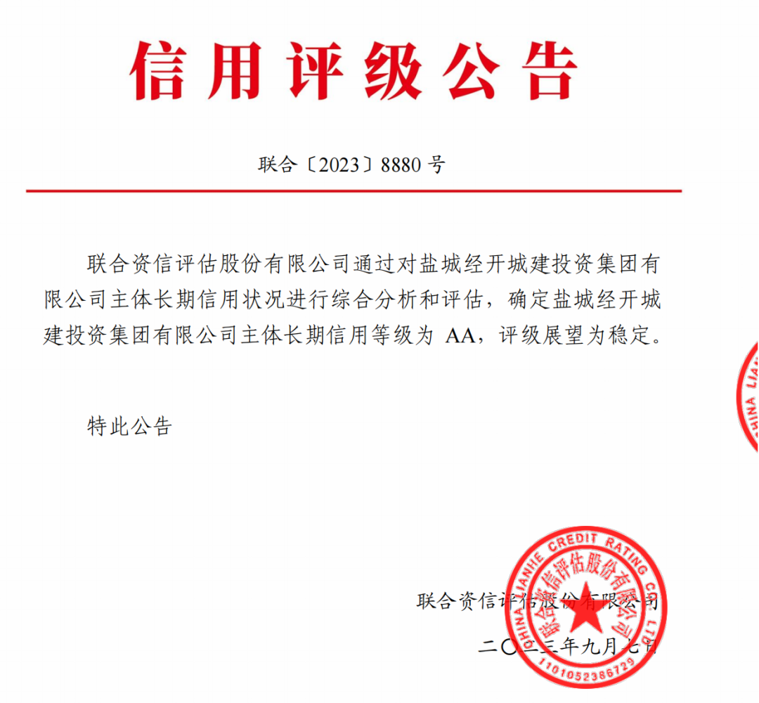 9月19日,經(jīng)中誠信國際信用評級有限責任公司(簡稱“中誠信國際”)綜合評定,鹽城經(jīng)開城投集團成功獲評AA主體信用評級,評級展望為“穩(wěn)定”。這是集團繼9月7日首次獲得聯(lián)合資信評估股份有限公司AA主體評級后,再次獲得頭部權威評級機構AA主體信用等級認定,是集團發(fā)展歷程上的又一次重大突破。
